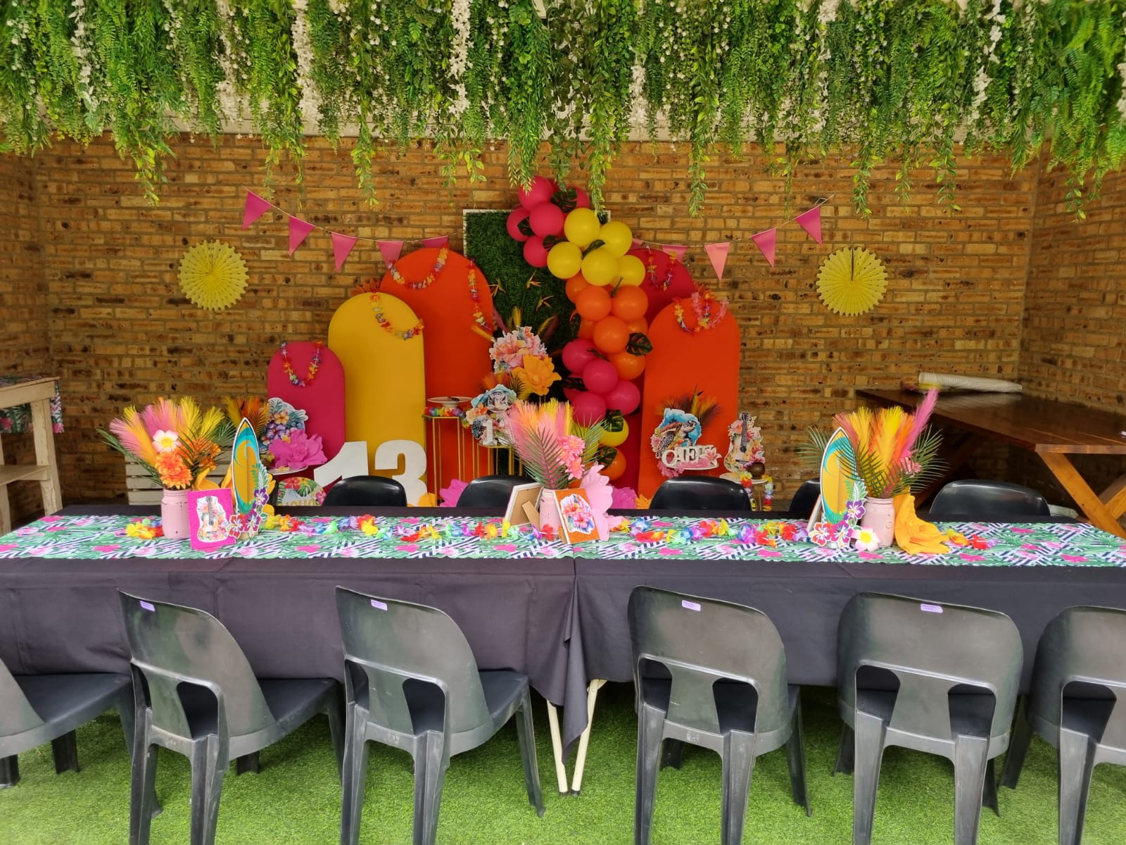 - 15x Adults - Entrance: 15x black chairs & 1 Big Wooden table for food, Cake Knife & Big Ice Bucket (galvanized steel beverage tub), Colour Paper Plates & Cups.